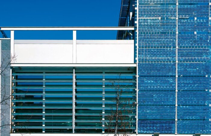 Author nicolas Published on: noviembre 1, 2024 Piel fotovoltaica Piel fotovoltaica Los módulos se integran simbólicamente con el diseño de la fachada y también funcionan como un filtro visual